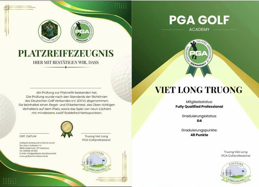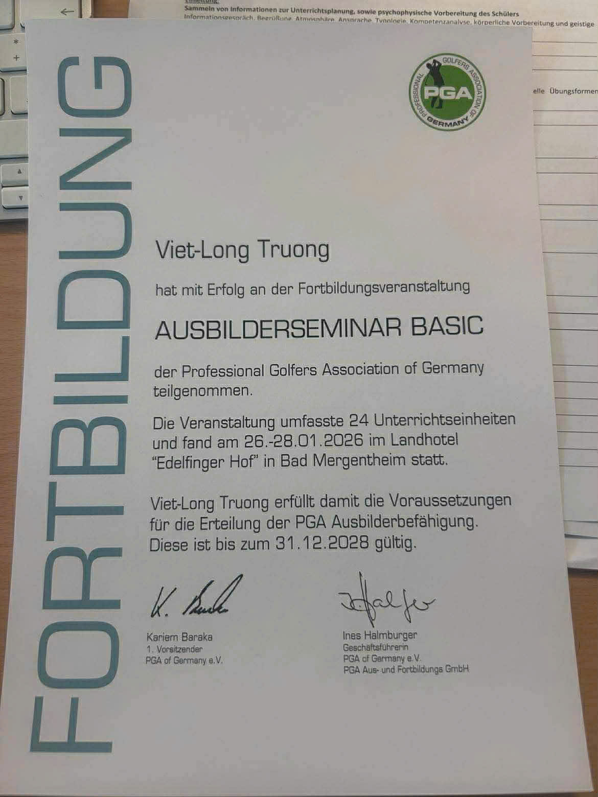Để trở thành huấn luyện viên golf chuyên nghiệp tại Đức, anh đã trải qua quá trình đào tạo và cấp chứng chỉ nghiêm ngặt theo tiêu chuẩn của Hiệp hội Golf Đức và hệ thống PGA.